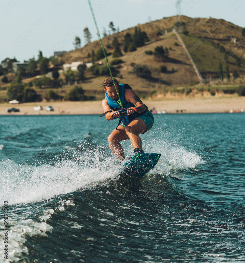 young man doing wakeboarding in a lake whit mountains also doing jumps