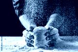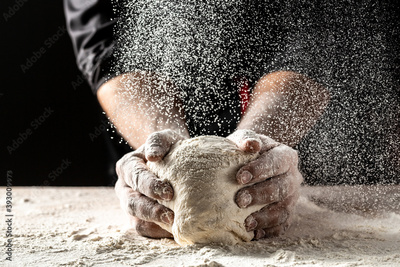 White flour flying into air as pastry chef in white suit slams ball dough on white powder covered table. concept of nature, Italy, food, diet and bio.