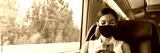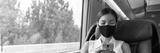 Train passenger Asian business woman using mobile phone during travel commute wearing face mask for corona virus pandemic. Panoramic banner of businesspeople commuting.