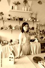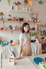 Young beautiful woman sitting at her workspace in ceramics ctudio with wet clay for modeling