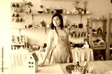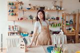 Young beautiful woman in natural color apron standing at her workspace in ceramics studio