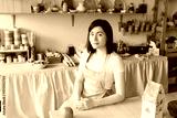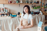Young beautiful woman sitting at her workspace in ceramics studio with wet clay for modeling