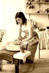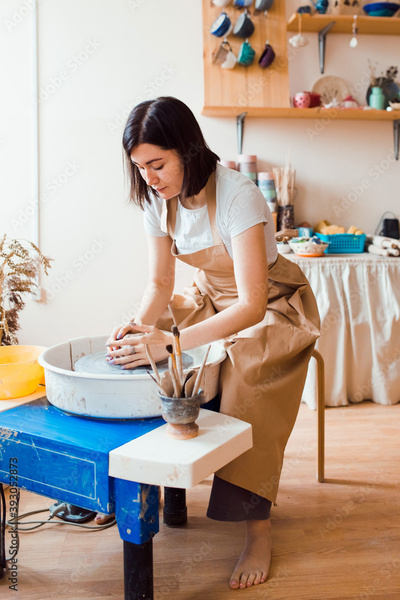 craftswoman sitting on bench and shaping clay in pottery workshop