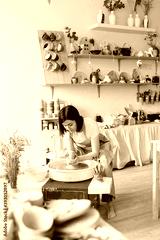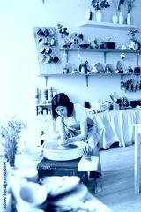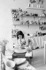 girl works in a ceramics workshop behind a potter's wheel