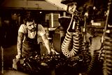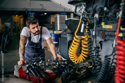 Confused hardworking tattooed bearded worker in overalls leaning on truck and trying to fix it. Firm for import and export interior.