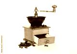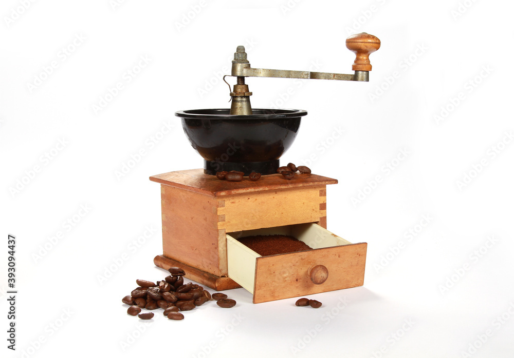 Old coffee grinder with coffee beans isolated on a white background