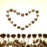 Heart symbol made of various red hearts and sweets with fresh red rose flowers on white background. Greeting card, mock up. Love, romance or Valentine's day concept. Flat lay, top view, copy space