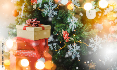 Merry Christmas 2020 and happy new year 2021 concept,Christmas holiday background. gold gift box a decoration on Christmas tree with bokeh and snow,copy space.
