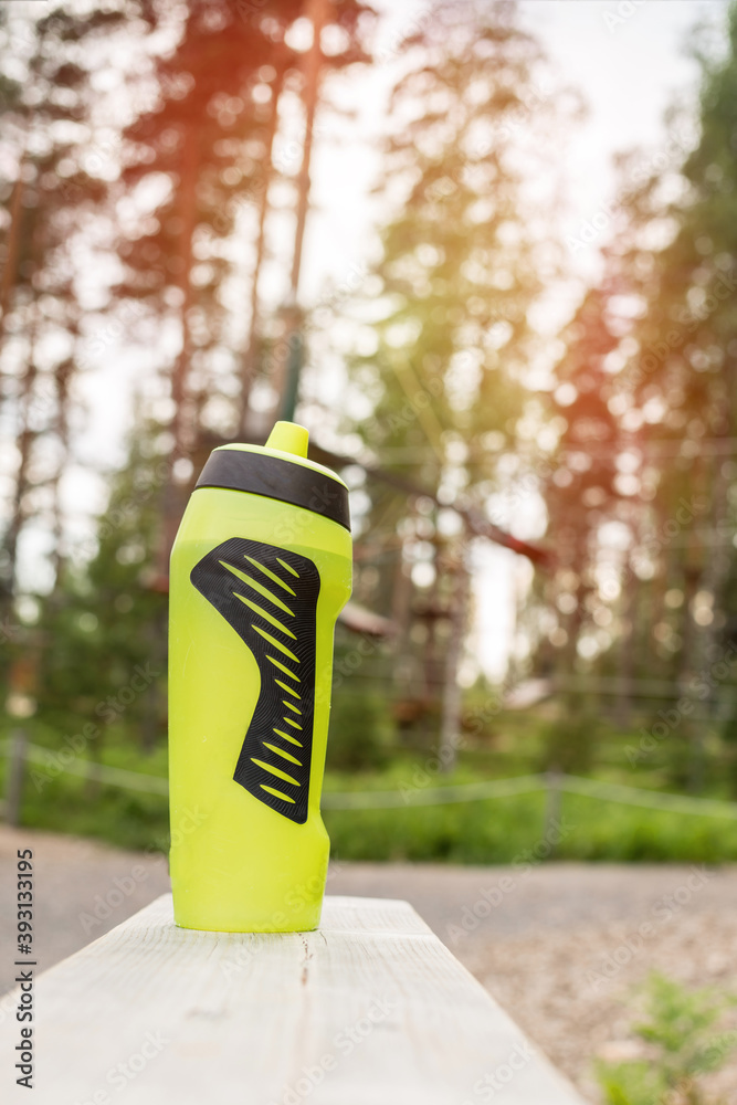 sport bottle for water drinking stands on wooden board in public park