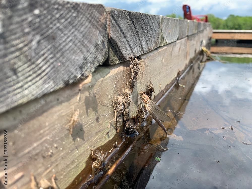 Dragonfly nymphs molt into their adult form on the side of a dock.