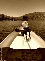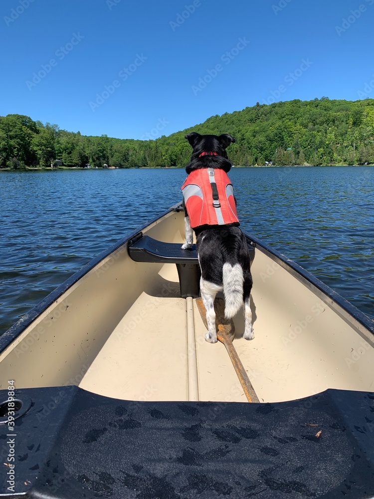 A black dog wearing a life jacket stand watch over the bow of a canoe.