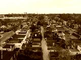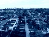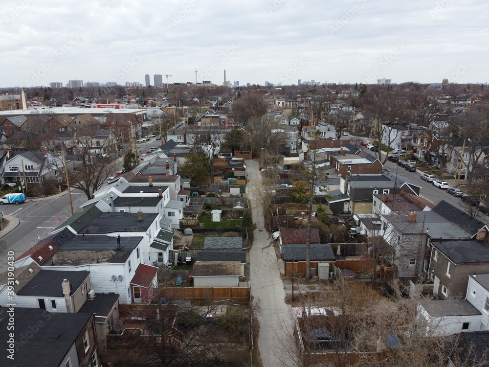An aerial drone view of a neighbourhood in the east end of Toronto.