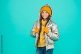 happy kid in silver puffer jacket and knitwear get warm in winter ready for activity on holidays, winter fashion