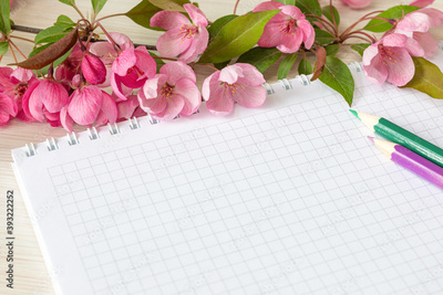 Empty notebook and pink apple blossoms on the white table. Woman working desk.