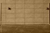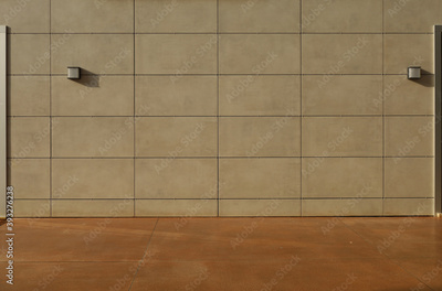 Ventilated facade with large gray stone tiles, two exterior lamps and a brown concrete pavement in front of it. Background for copy space.