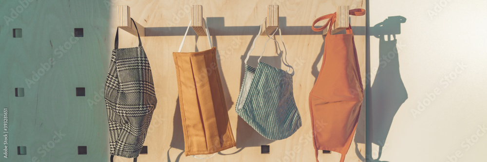 Coronavirus face masks hanging at home closet banner. DIY handmade mask cotton three layers ply. Corona virus prevention facial covering. Panoramic of PPE mask option for corona virus prevention.