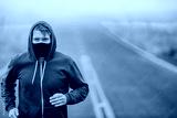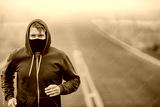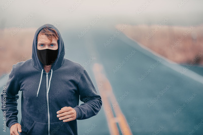 Sports mask endurance athlete runner running outside on road training while wearing facial covering in cold weather winter fog. Male jogger man jogging.
