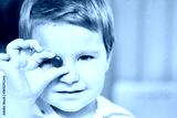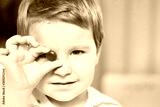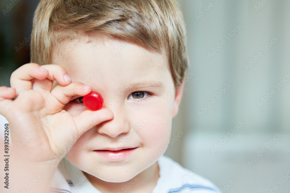 Boy holds a red candy in one hand