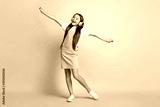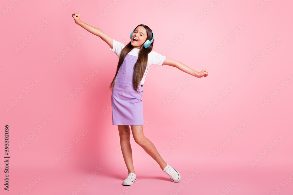 Full size photo of excited kid girl listen wireless headset music sing wear violet overall isolated on pastel color background