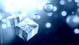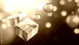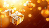 Gold christmas gifts and hanging bauble against bokeh lights background