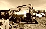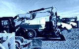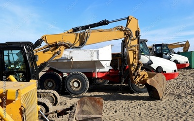Yellow excavators and white dumping trucks lined up on the sand.