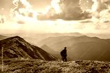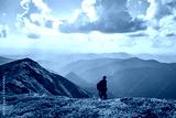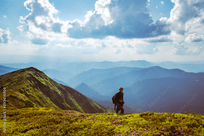 Photographer taking photo of rhododendron flowers covered mountains meadow in summer time. Landscape photography