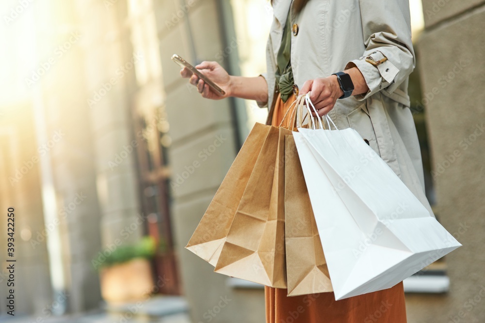 Texting sms to a friend. Cropped shot of a woman with shopping bags using her smartphone while standing on city street outdoors