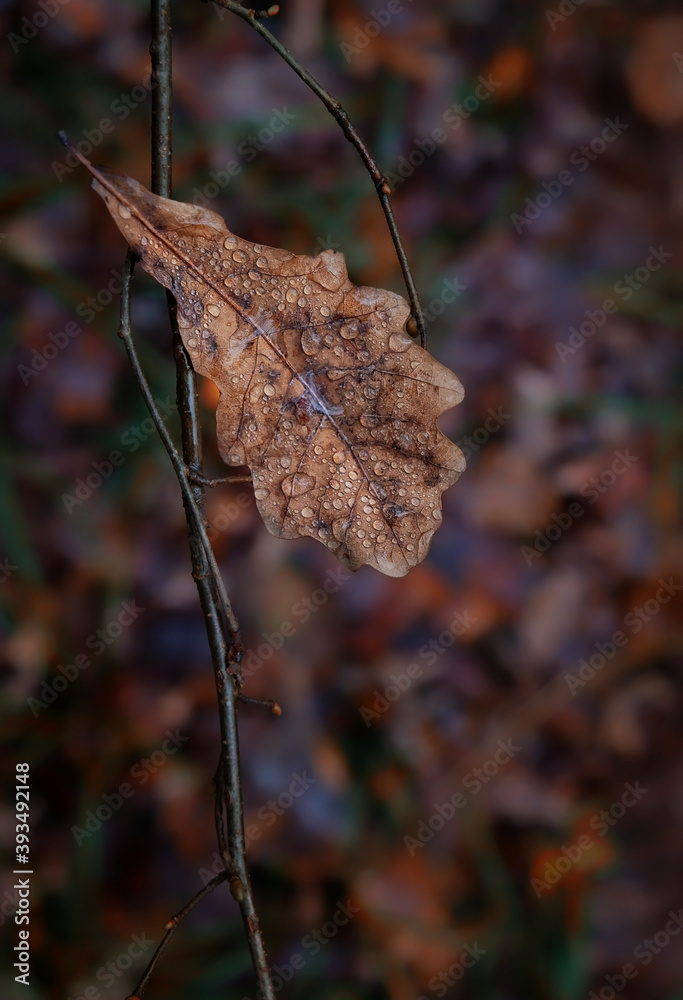 autumn oak leaf in rain drops. nature fall abstract background. autumn season concept. rainy day. copy space