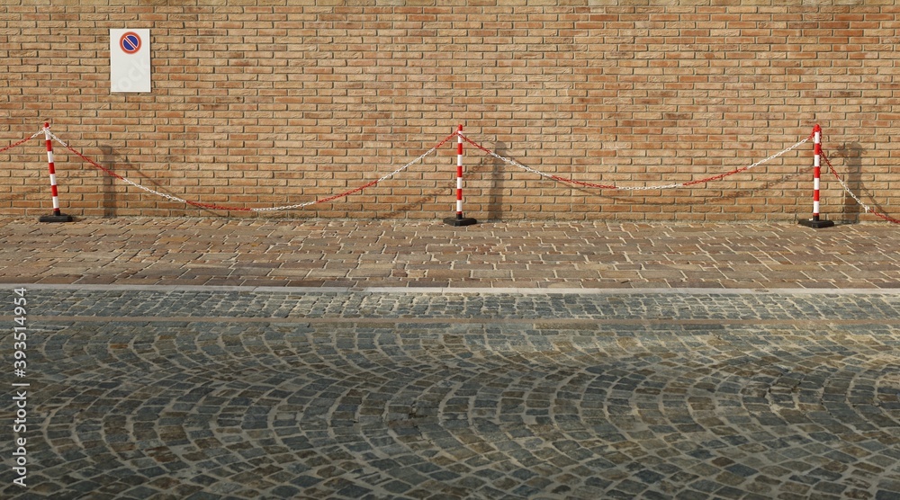 Brick wall with plastic bollards and chain on tiled brown stone sidewalk in front. Porphyry road. Background for copy space.