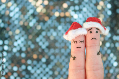 Fingers art of displeased couple celebrates Christmas. Concept of sad man and woman in new year hats.