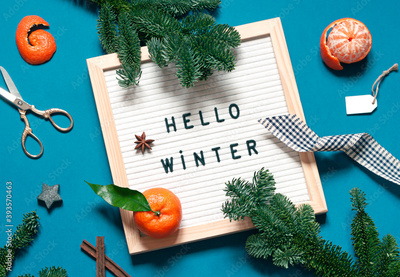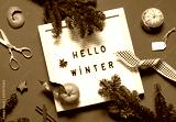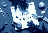 Hello winter concept festive winter holiday composition. Christmas or New Year greeting card flat lay