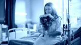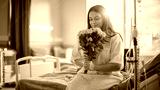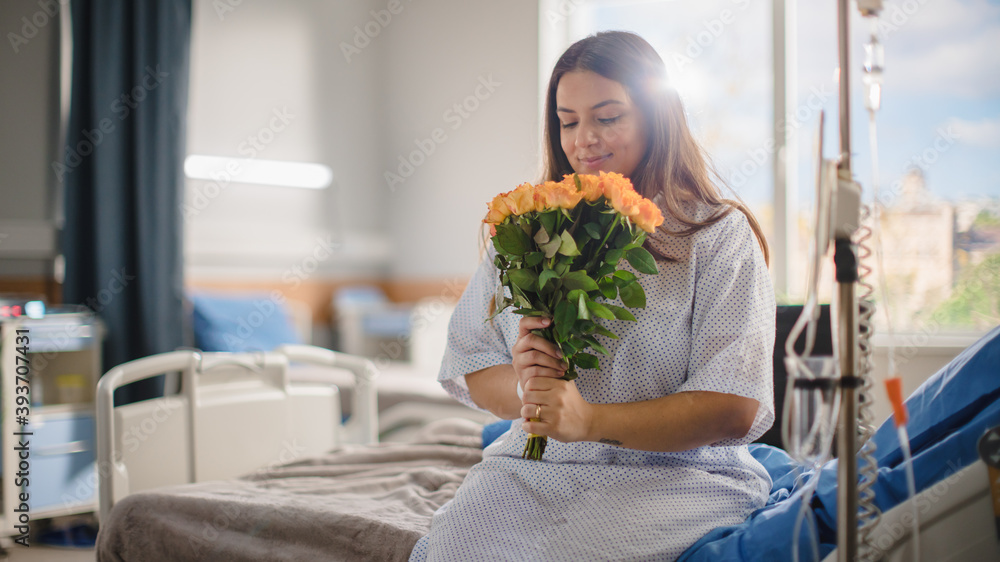 Hospital Ward: Happy Smiling Latin Female Patient is Sitting on Bed and Holding Received Yellow Flowers with Good Analysis Results. Her Treatment is Already Done. Woman Recovering after Surgery.