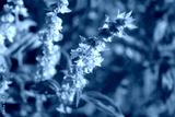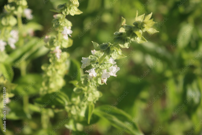 Close-up of Basil plant in bloom with little white flower on branch. Ocimum basilicum on selective focus
