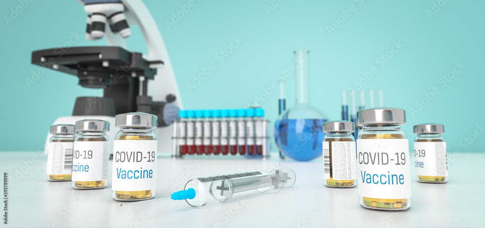 Vaccine for coronavirus in labolatory. Medication for Covid-19 in bottles. Treatment for coronavirus made in lab. 3D rendering.