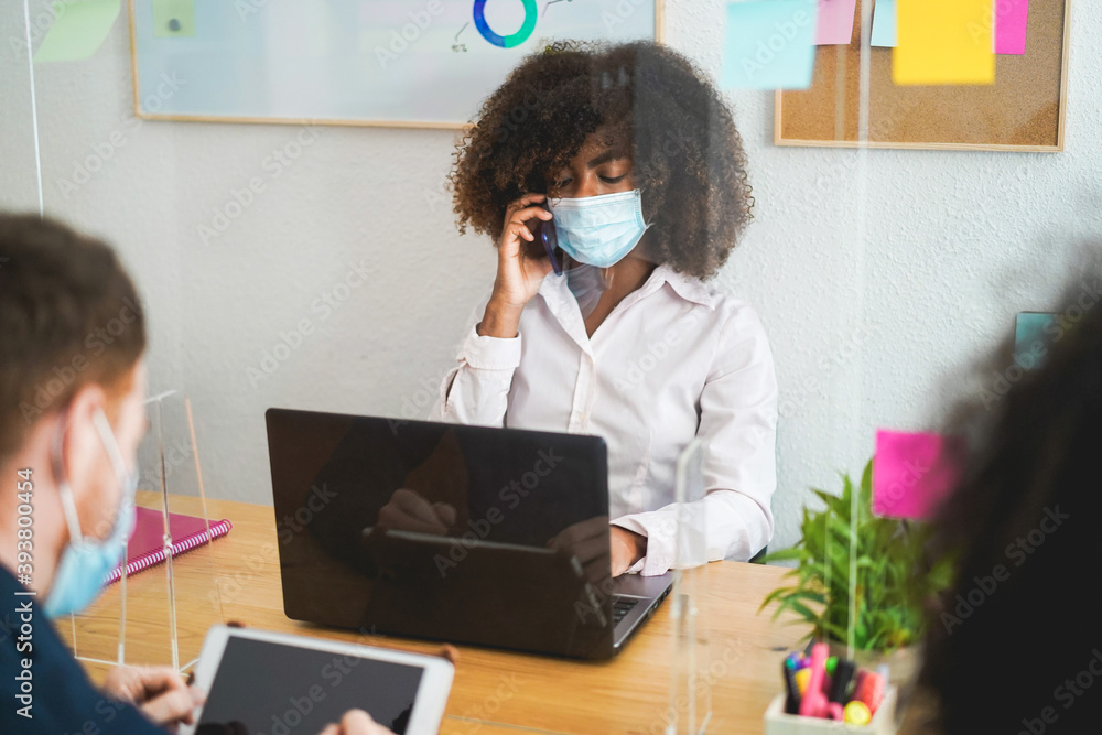 Multiracial people working while wearing protective masks inside modern office with safety plexiglass - Social distance and business job during coronavirus outbreak - Focus on woman's face
