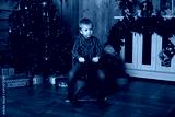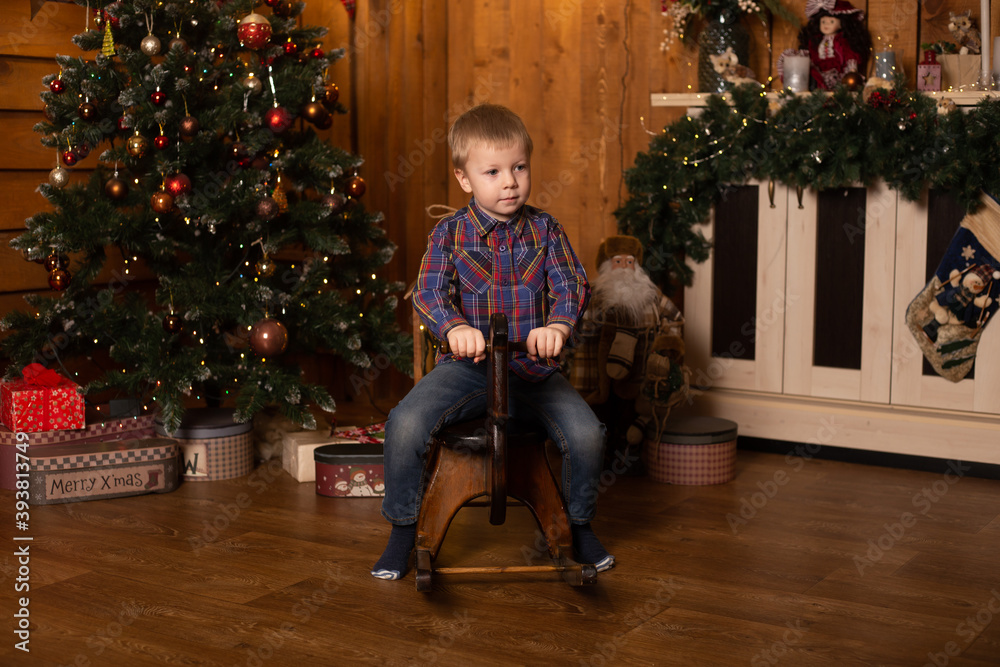 Cute baby boy riding wooden traditional rocking horse toy near Christmas tree at festive decorated home