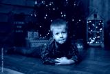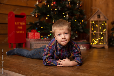 Boy near at home tree decorated for Christmas. Merry Christmas and Happy New Year.