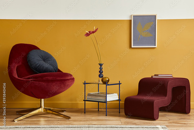Unique living room in modern style interior with mock up poster frame, design red velvet armchair, elegant furniture, decoration and pesronal accessories in home decor. Honey yellow wall. Template.