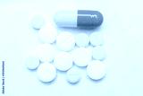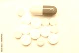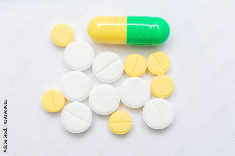 Collection of the colorful pills with medicines, white background, copy space, top view