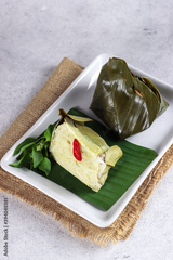 Delicious traditional Indonesian culinary, Tum Ayam or gadon ayam or botok, steamed minced chicken mix with herb spices and wrapped with banana leaf.