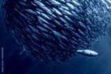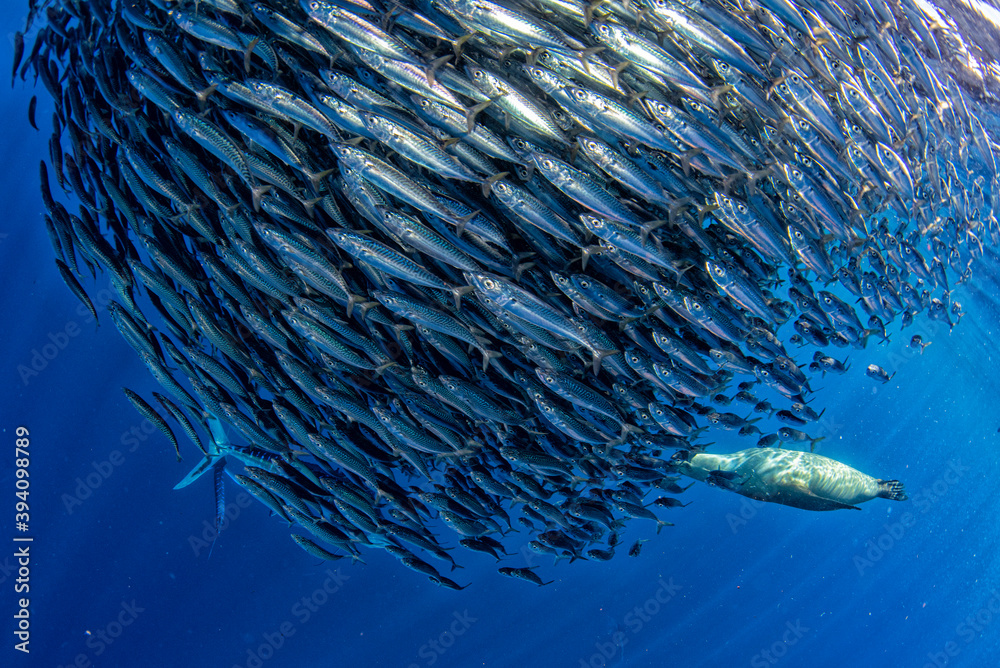 Striped marlin and sea lion hunting in sardine bait ball in pacific ocean