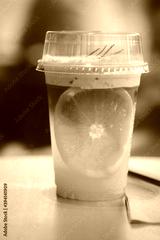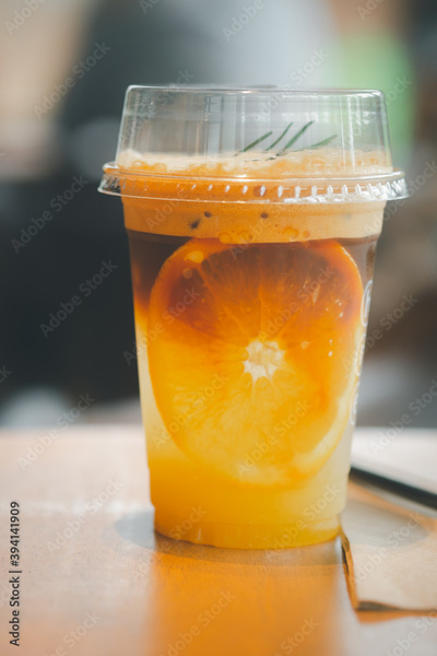 Espresso shot mix with orange soda decoration with large slice orange in inside.