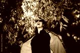 Young sitting woman opens her jacket at sunset in a park in autumn
