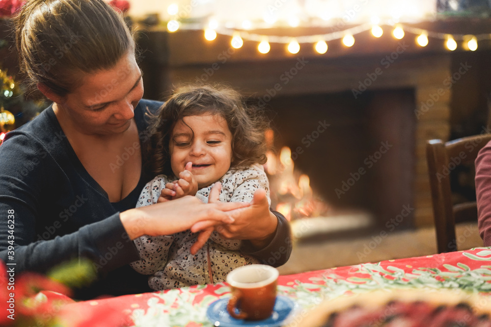Happy mother playing with her daughter during Christmas time at home with fireplace in background - Family, love and holidays concept - Soft focus on mum nose