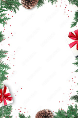 Fir branch and gift on white background with copy space for text. Christmas. Holiday concept.