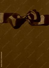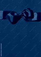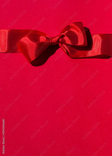 Red festive bow on the red background. Christmas or Valentine's day concept card. Copy space