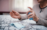 Keep your hands clean. Woman disinfects hands with sanitizer spray against viruses, close up photo. Health care concept