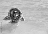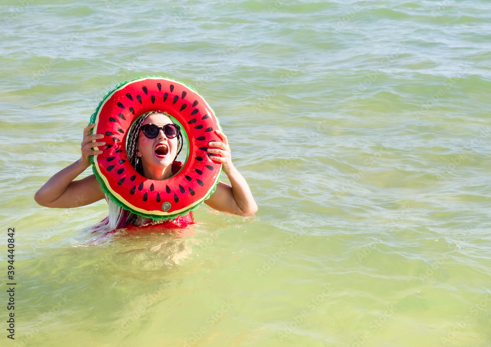 Beautiful millennial girl with a circle for swimming at the sea smiles happily and looks at the camera while standing at sea. The concept of leisure and entertainment. Copy space