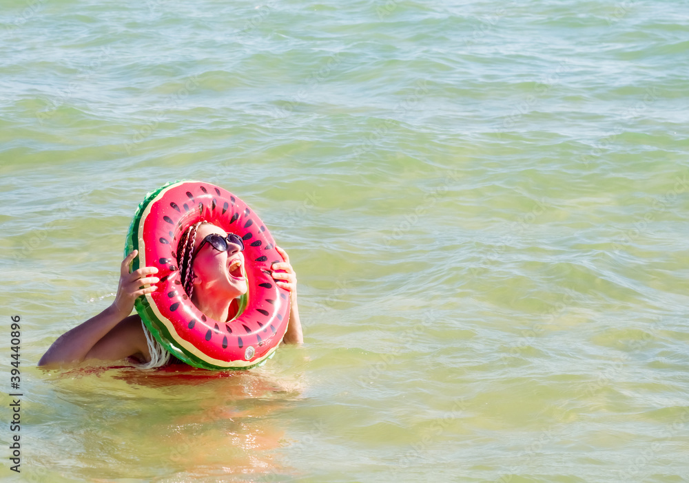 Beautiful millennial girl with a circle for swimming at the sea smiles happily and looks at the camera while standing at sea. The concept of leisure and entertainment. Copy space