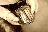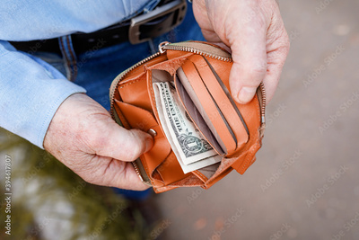 Senior man looks in his purse with one dollar. Consequences of the crisis and coronavirus.